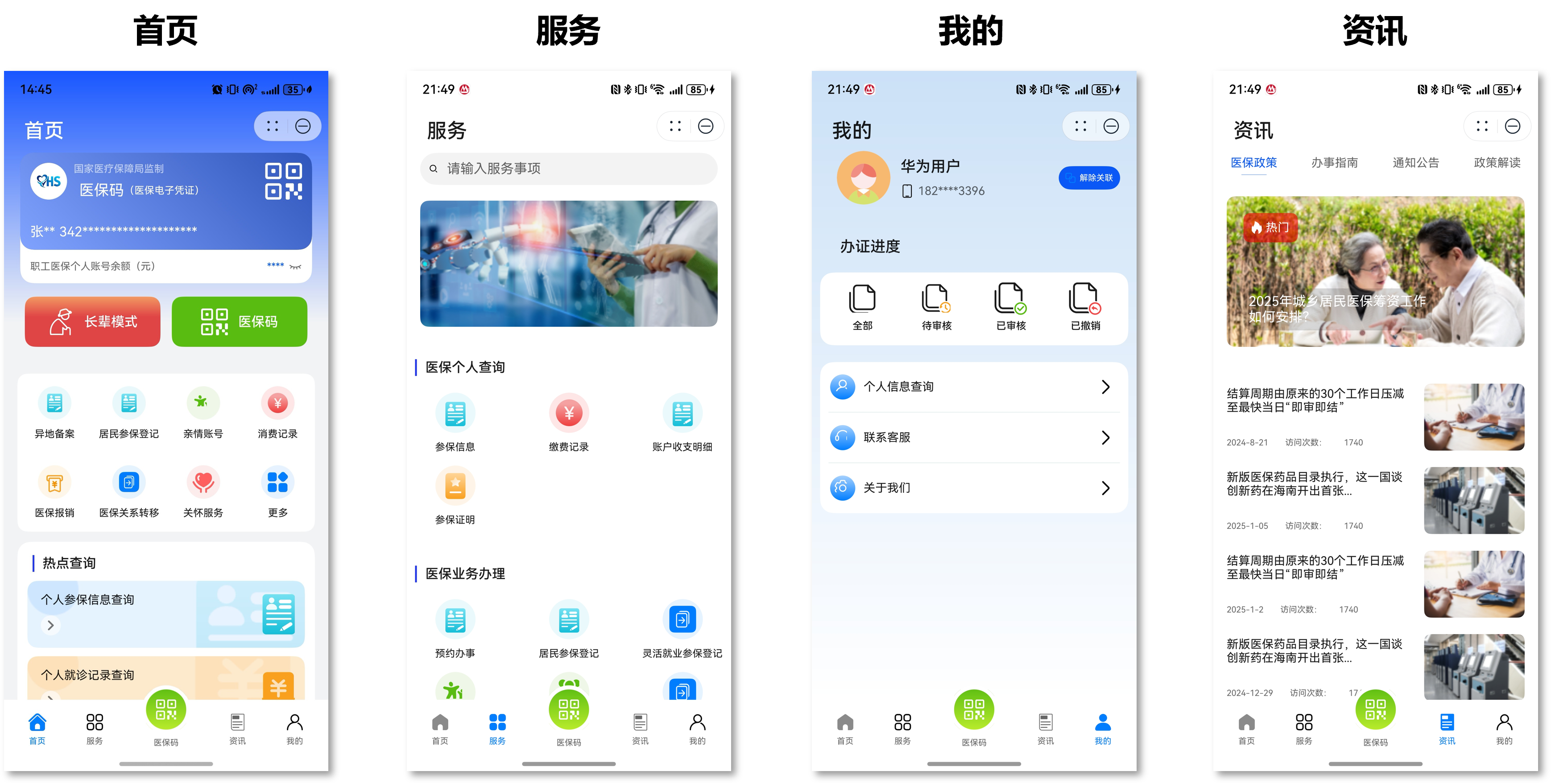 1. 首页:主要提供医保码展示,长辈模式,以及热点查询,便民服务等功能