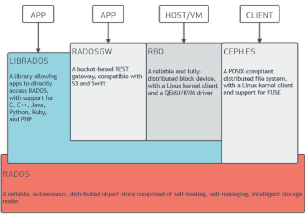 Ceph的底层是RADOS,RADOS本身也是分布式存储系统,CEPH所有的存储功能都是基于RADOS实现。RADOS采用C++开发,所提供的原生Librados API包括C和C++两种。Ceph的上层应用调用本机上的librados API,再由后者通过socket与RADOS集群中的其他节点通信并完成各种操作。