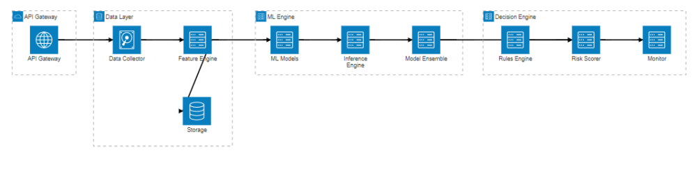 金融风控AI引擎的架构设计需要兼顾实时性、准确性和可扩展性。基于微服务架构,我们将系统划分为数据接入层、特征工程层、模型推理层、决策引擎层和监控管理层。