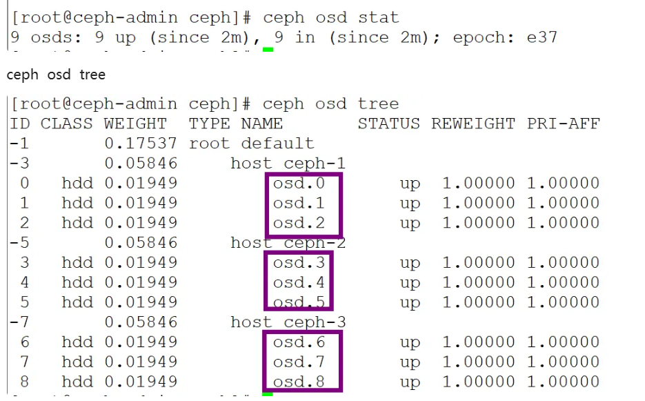 ceph-deploy --overwrite-conf osd create ceph-1 --data /dev/sdb ceph-deploy --overwrite-conf osd create ceph-1 --data /dev/sdc ceph-deploy --overwrite-conf osd create ceph-1 --data /dev/sdd ceph-deploy --overwrite-conf osd create ceph-2 --data /dev/sdb ceph-deploy --overwrite-conf osd create ceph-2 --data /dev/sdc ceph-deploy --overwrite-conf osd create ceph-2 --data /dev/sdd ceph-deploy --overwrite-conf osd create ceph-3 --data /dev/sdb ceph-deploy --overwrite-conf osd create ceph-3 --data /dev/sdc ceph-deploy --overwrite-conf osd create ceph-3 --data /dev/sdd