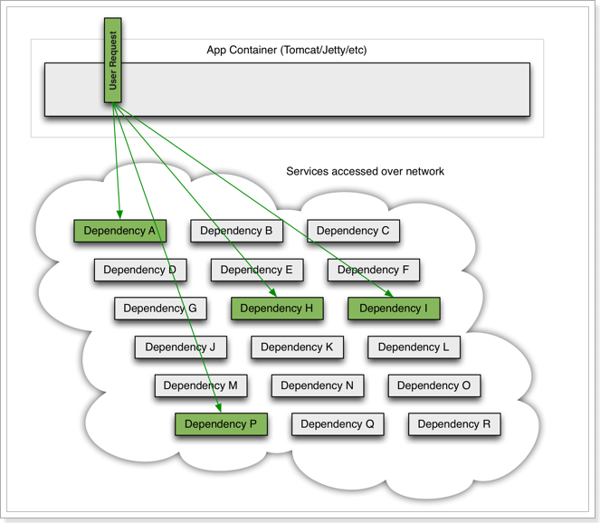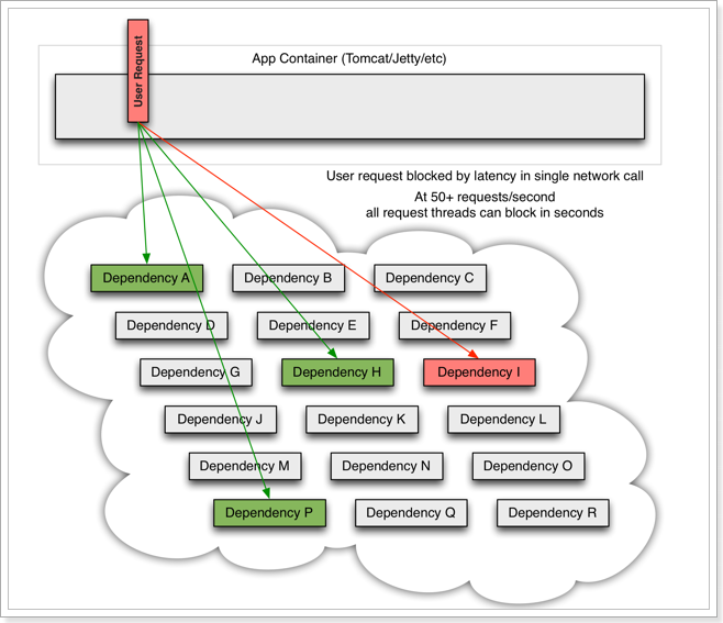 如图,如果服务提供者I发生了故障,当前的应用的部分业务因为依赖于服务I,因此也会被阻塞。此时,其它不依赖于服务I的业务似乎不受影响。