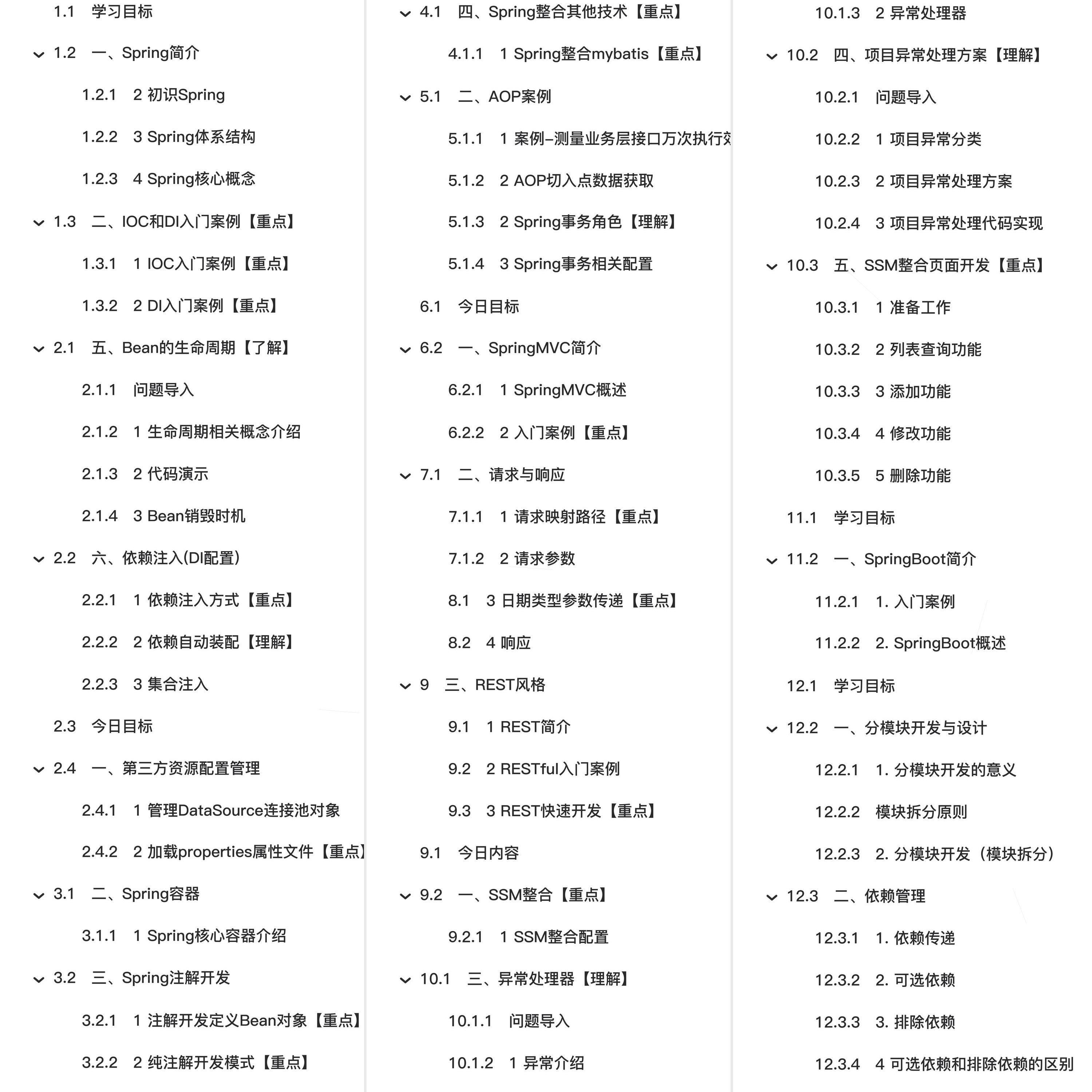 🏆🏆🏆教程全知识点简介:学习目标 一、Spring简介 2 初识Spring 3 Spring体系结构 二、IOC和DI入门案例【重点】 五、Bean的生命周期【了解】 问题导入 1 生命周期相关概念介绍 2 代码演示 3 Bean销毁时机 六、依赖注入(DI配置) 1 依赖注入方式【重点】 2 依赖自动装配【理解】 3 集合注入 今日目标 一、第三方资源配置管理 1 管理DataSource连接池对象 2 加载properties属性文件【重点】 四、Spring整合其他技术【重点】 二、AOP案例 1 案例-测量业务层接口万次执行效率 2 AOP切入点数据获取 2 Spring事务角色【理解】 二、请求与响应 1 请求映射路径【重点】 2 请求参数 3 日期类型参数传递【重点】 4 响应 三、REST风格 1 REST简介 2 RESTful入门案例 3 REST快速开发【重点】 今日内容 一、SSM整合【重点】 1 SSM整合配置 三、异常处理器【理解】 1 异常介绍 2 异常处理器 一、分模块开发与设计 1. 分模块开发的意义 模块拆分原则 2. 分模块开发(模块拆分) 二、依赖管理 1. 依赖传递 2. 可选依赖 4 可选依赖和排除依赖的区别 三、聚合与继承 1. 聚合工程 3. 继承关系 5. 聚合与继承的区别 四、属性管理 1. 属性 2. 版本管理 五、多环境配置与应用 1. 多环境配置作用 2. 跳过测试(了解) 六、私服 2. 私服仓库分类 3. 资源上传与下载 附件1:POM文件总体配置说明 一、MyBatisPlus简介 1. 入门案例 二、标准数据层开发 2. Lombok插件介绍 四、DML编程控制 1. id生成策略控制(Insert) 2. 多记录操作(批量Delete/Select) 3. 逻辑删除(Delete/Update) 4. 乐观锁(Update)