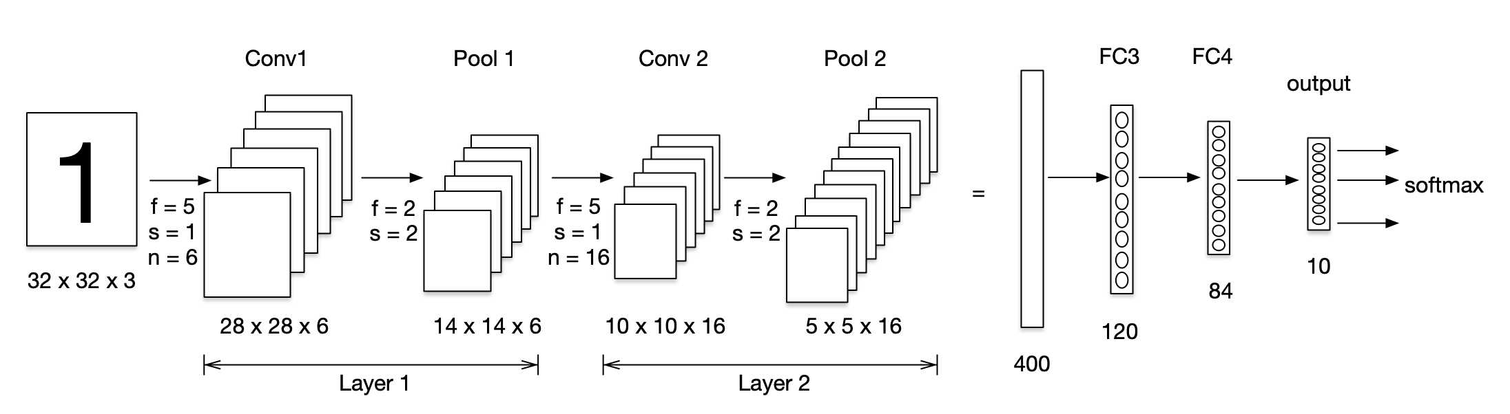 首先 从一个稍微早一些的卷积网络结构LeNet-5(这里稍微改了下名字),开始的目的是用来识别数字的。从前往后介绍完整的结构组成,并计算相关输入和输出。