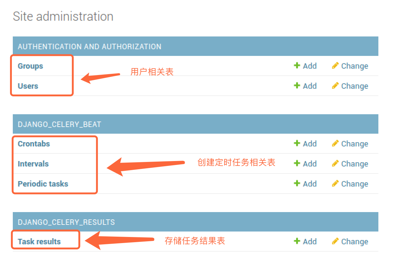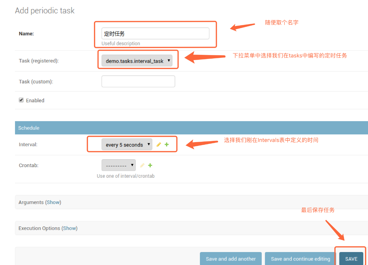 其中Crontabs用于定时某个具体时间执行某个任务的时间,Intervals用于每隔多久执行任务的事件,具体任务的执行在Periodic tasks表中创建。