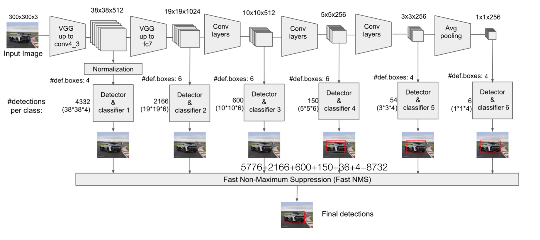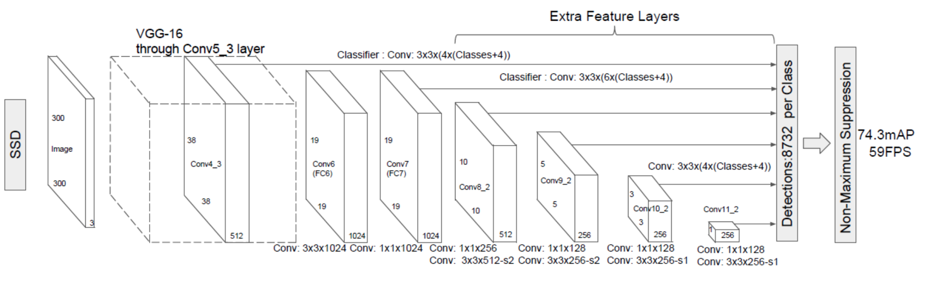 以VGG-16为基础,使用VGG的前五个卷积,后面增加从CONV6开始的5个卷积结构,输入图片要求300*300。