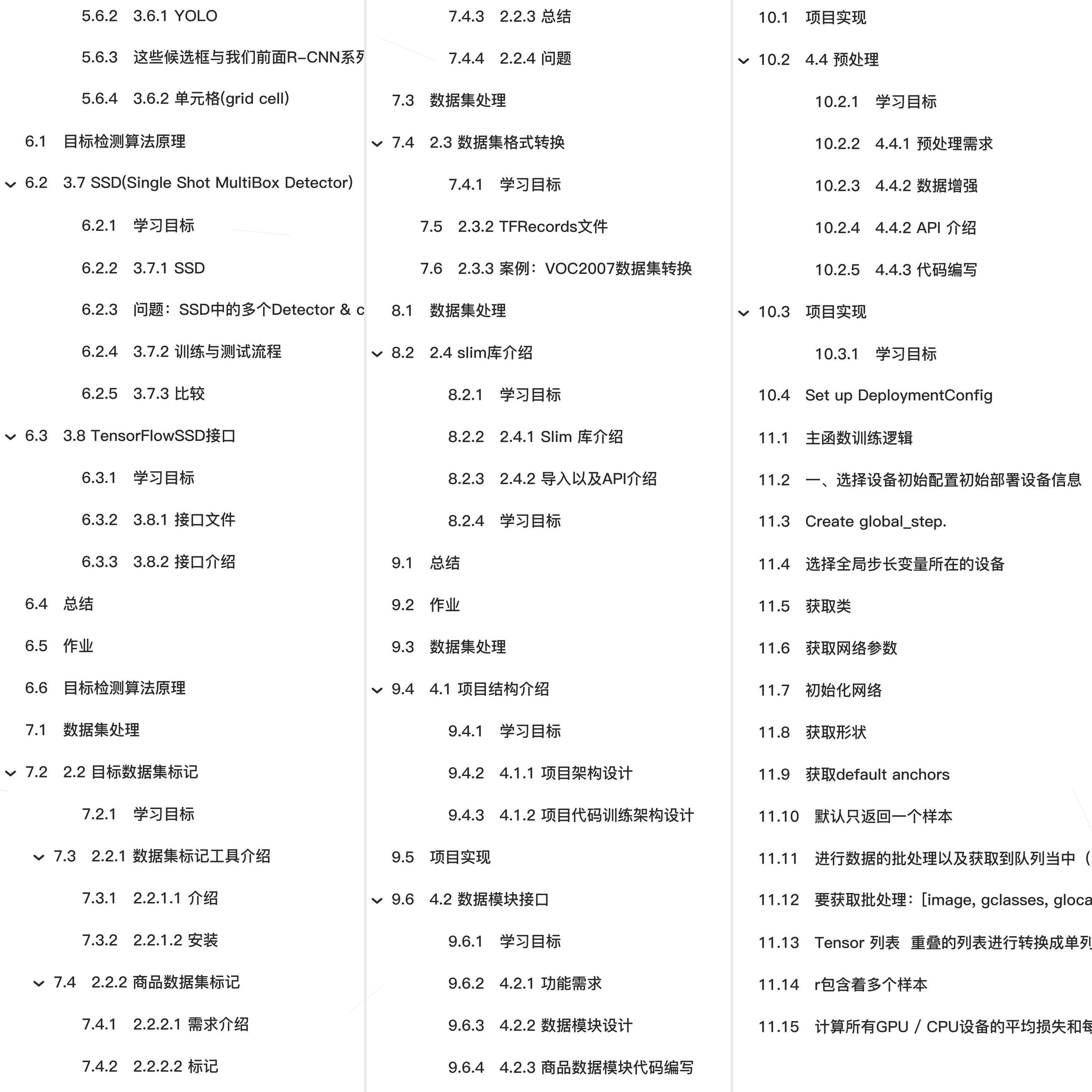 🏆🏆🏆教程全知识点简介:涵盖图像识别背景、目标检测定义和应用场景。核心算法原理包括R-CNN系列算法(R-CNN、SPPNet、Faster R-CNN、RPN原理)、YOLO算法(单次检测、候选框机制、单元格概念)以及SSD算法(单次多框检测器、多个Detector & classifier、训练与测试流程)。数据处理模块包含目标数据集标记、数据集格式转换(TFRecords文件、VOC2007数据集)、slim库和API使用。项目实现涉及项目结构设计、数据模块接口、预处理和数据增强技术。模型训练包括预训练模型、SSD模型定义、default boxes、模型加载、变量初始化、交互式会话。模型推理涵盖predictions筛选、bbox处理、scores排序、NMS算法。部署方案包括Web Server、TensorFlow Serving Client、环境安装、DeploymentConfig配置。训练主函数包含设备选择、全局步长变量、网络参数获取、批处理数据队列、多GPU/CPU平均损失计算。