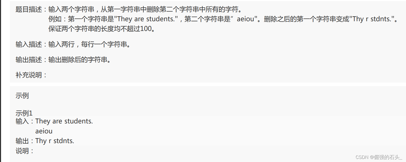 - 第二种方法:因为题目没有要求处理后的数据,只要求打印在屏幕。所以每找到一个不需要删除的元素时,直接打印该字符也可以解决问题