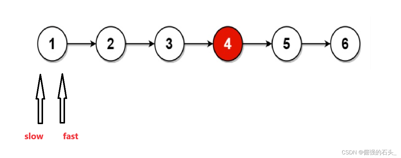 - 偶数个元素的链表,fast指针最终会落在最后一个节点后面的NULL,此时slow指向的节点即为中间节点的第二个节点