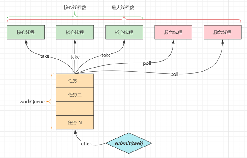 - workQueue - 当没有空闲核心线程时,新来任务会加入到此队列排队,队列满会创建救急线程执行任务