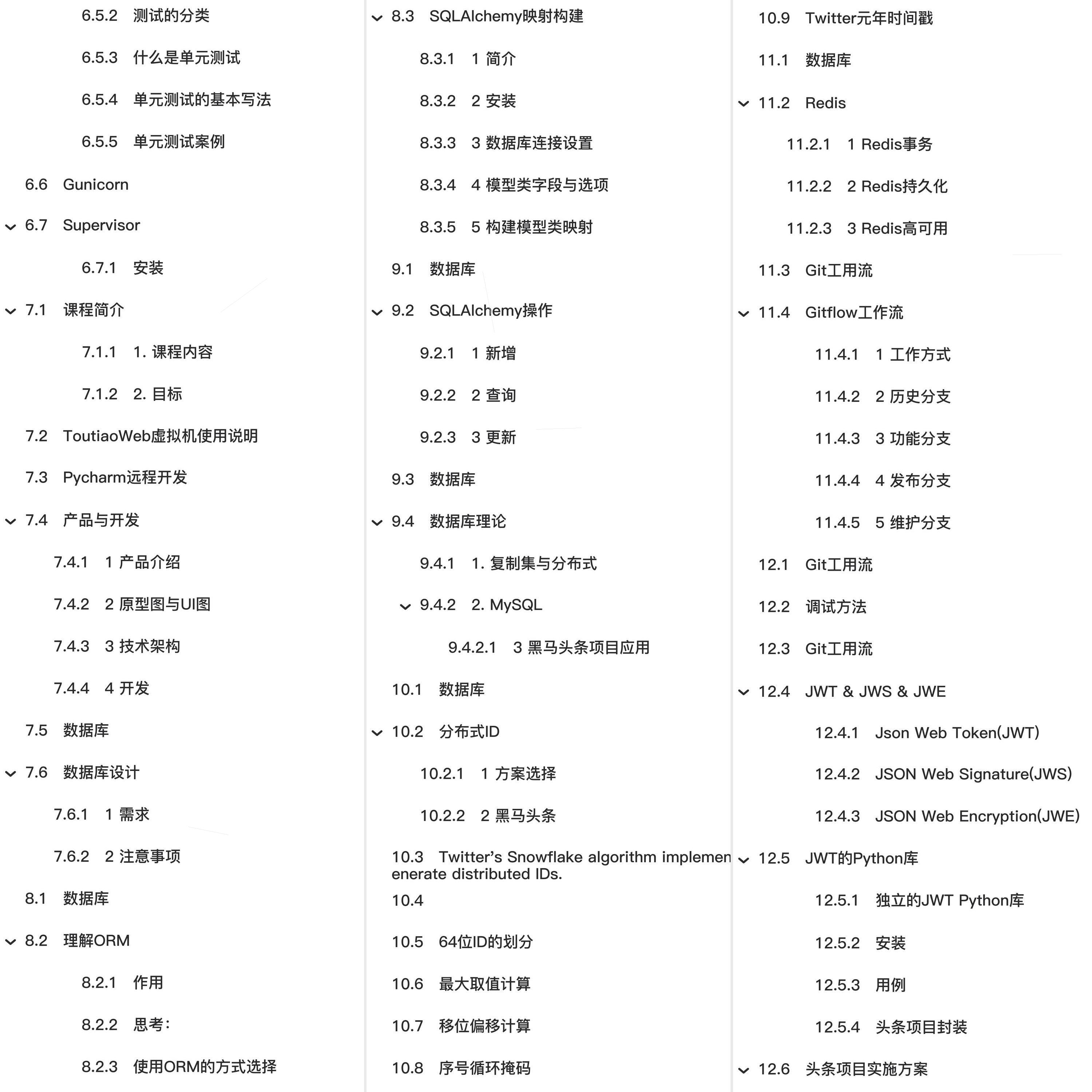 🏆🏆🏆教程全知识点简介:1.APScheduler任务调度涵盖安装配置、使用方式、调度器Scheduler、执行器executors、触发器Trigger等核心组件。2. RPC远程过程调用包括RPC概念、背景用途、优缺点分析。3. Protocol Buffers数据序列化涉及文档结构、注释语法、数据类型、枚举类型、消息类型(字段编号、字段规则、嵌套类型、保留字段、默认值)。4. 客户端开发包含头条首页新闻推荐接口编写。5. 即时通讯技术涵盖需求场景、传统推送实现、Socket.IO(Python服务器端开发、事件处理)。6. Elasticsearch搜索引擎包括简介原理、倒排索引、分析器、相关性排序、集群概念、IK中文分析器、索引类型、文档操作(索引文档、获取文档、判断存在、更新删除)、Logstash数据导入、查询(基本查询、高级查询)、全文检索实现、Python客户端使用、联想提示(拼写纠错、自动补全)。7. 单元测试涵盖测试分类、基本写法、测试必要性。8. 服务器部署包括Gunicorn、Supervisor配置管理。9. 项目开发流程涉及产品介绍、原型图UI图、技术架构、开发环境(ToutiaoWeb虚拟机、Pycharm远程开发)。10. 数据库技术包含ORM理解、SQLAlchemy映射构建、数据库连接设置、模型类字段选项。11. 分布式系统涵盖分布式ID方案选择、Twitter Snowflake算法(64位ID划分、最大取值计算、移位偏移计算、序号循环掩码、时间戳处理)。12. Redis数据库包括Redis持久化机制。13. Git工作流涵盖Gitflow工作流(工作方式、历史分支、功能分支、发布分支、维护分支)、调试方法。14. 身份认证技术包含JWT、JWS、JWE概念、Python库使用、项目封装实施方案。15. 对象存储涉及OSS对象存储、七牛云存储服务。16. 缓存系统包括缓存架构、缓存数据保存方式、缓存有效期TTL、缓存淘汰策略、缓存问题(缓存穿透、缓存雪崩)、头条项目缓存设计(User Cache、Article Cache、Announcement Cache)、持久存储设计(阅读历史、搜索历史、统计数据)。
