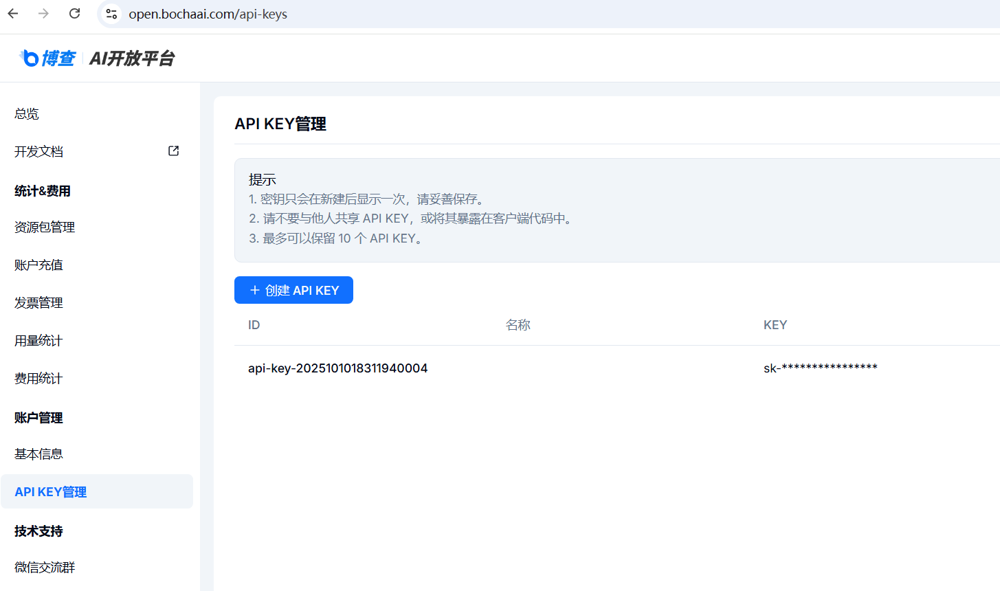 创建博查API-KEY https://open.bochaai.com/api-keys