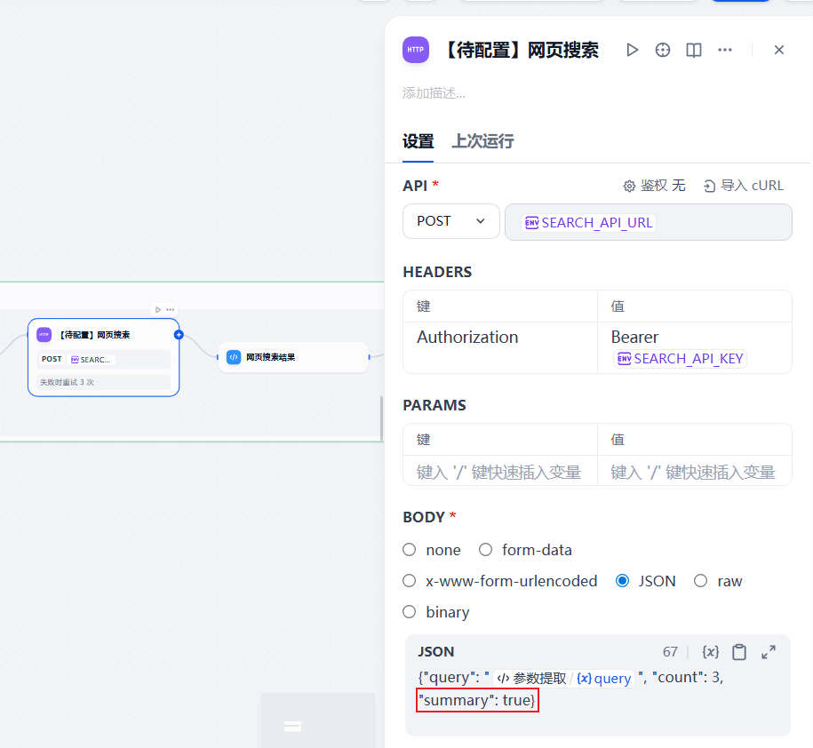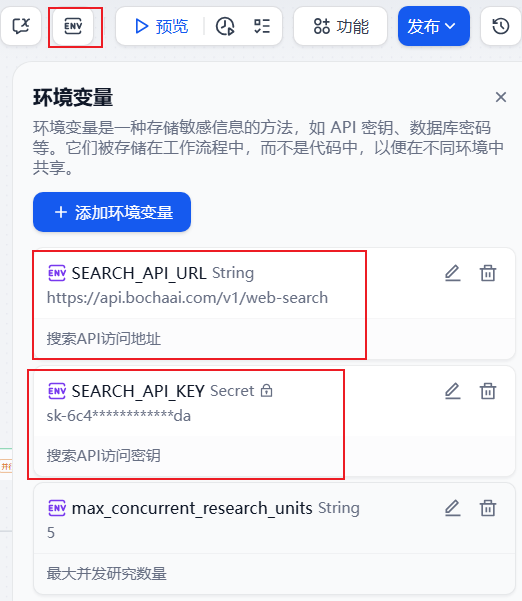 为了方便管理工作流中的参数,可通过环境变量使用联网搜索参数