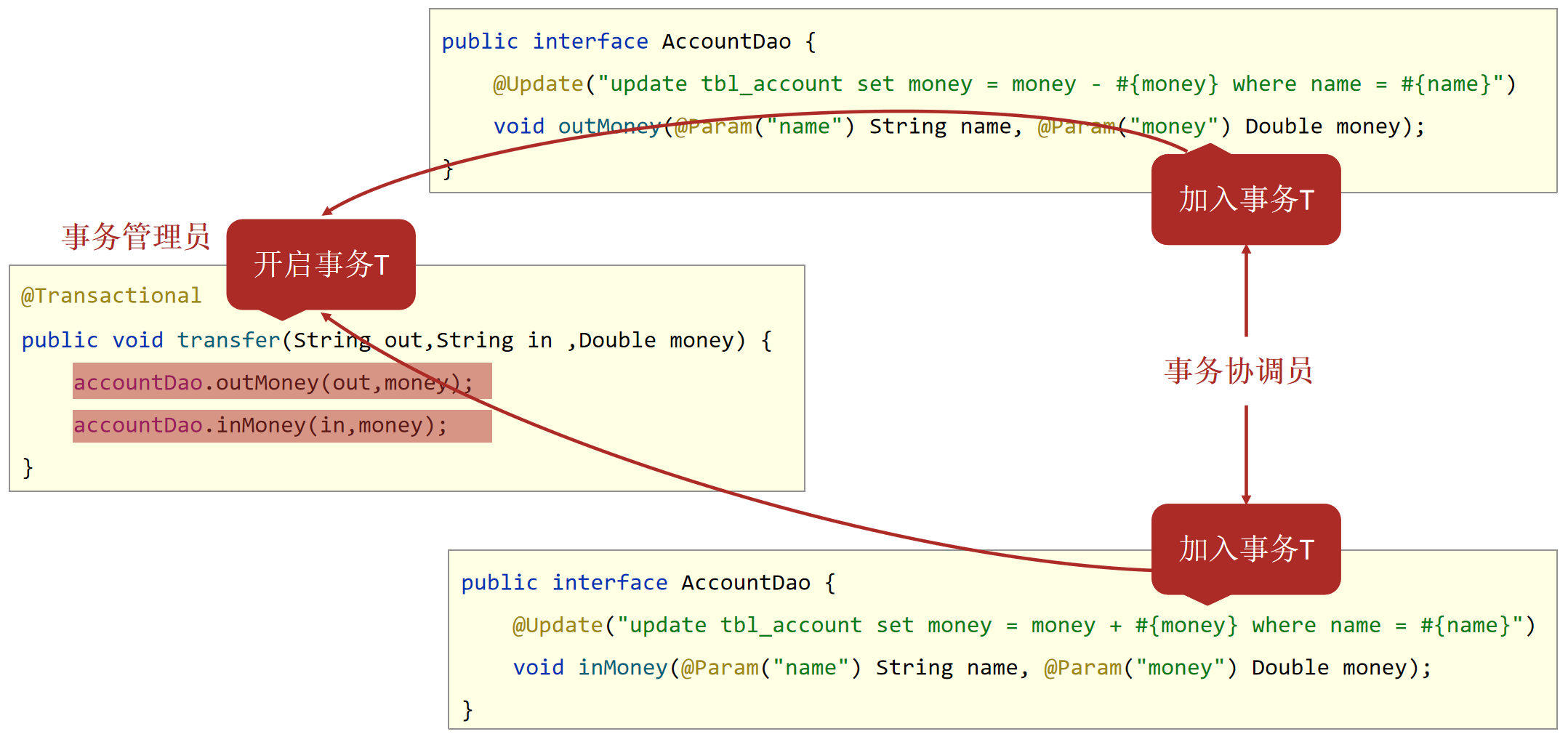 - 事务协调员:加入事务方,在Spring中通常指代数据层方法,也可以是业务层方法