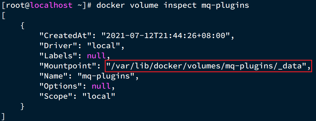 之前设定的RabbitMQ的数据卷名称为mq-plugins,所以 使用下面命令查看数据卷:
