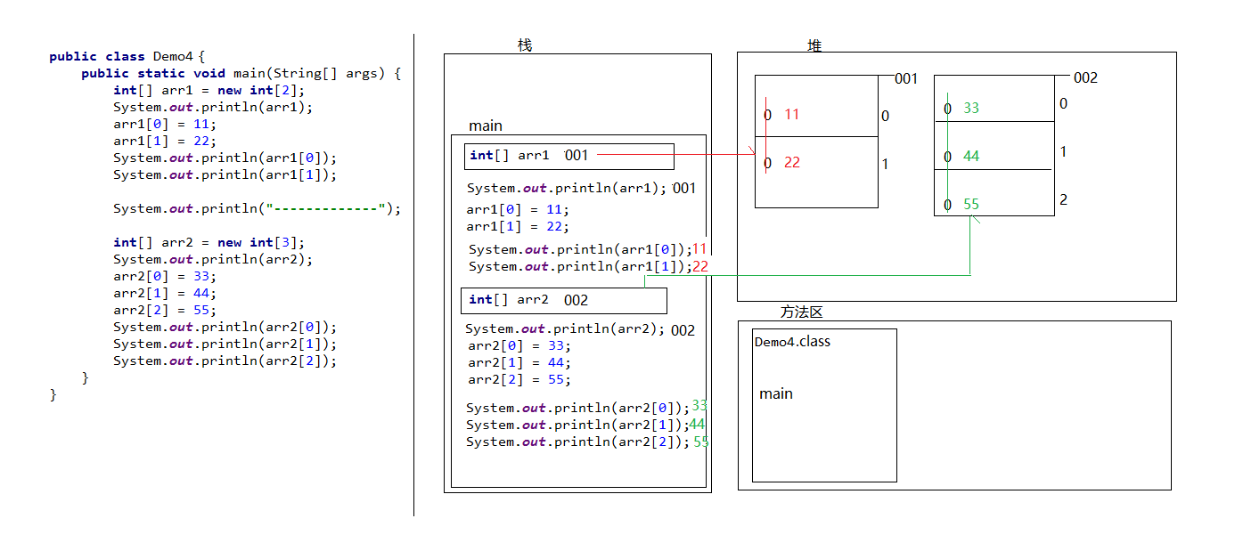 数组静态初始化 : 初始化时指定每个数组元素的初始值,由系统决定数组长度