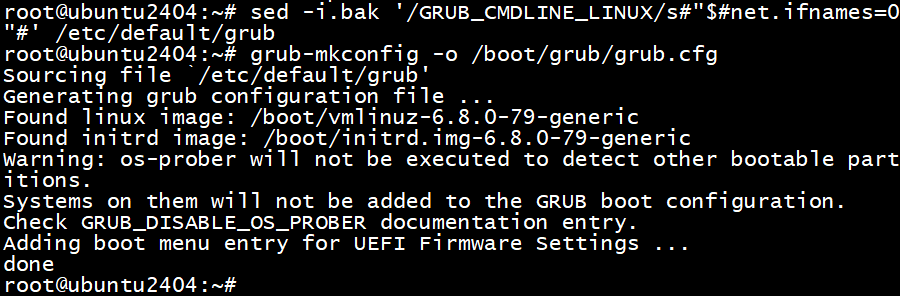 sed -i.bak '/GRUB_CMDLINE_LINUX/s#"$#net.ifnames=0"#' /etc/default/grub