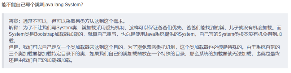 假设你自己的类加载器用双亲委派,那么优先由启动类加载器加载真正的 java.lang.System,自然不会加载假冒的