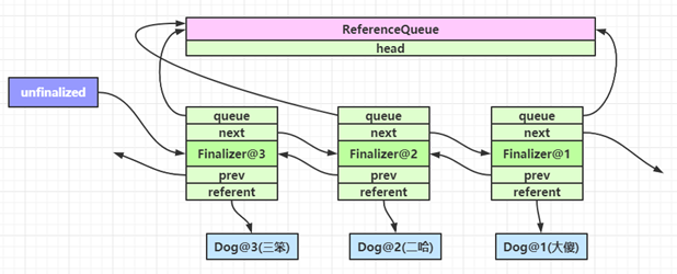 - 但此时 Dog 对象还没法被立刻回收,因为 unfinalized -> Finalizer 这一引用链还在引用它嘛,为的是【先别着急回收啊,等我调完 finalize 方法,再回收】