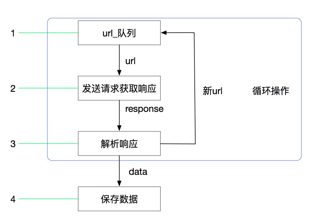 - 爬虫提取url地址,组装成request对象---->爬虫中间件--->引擎--->调度器,重复步骤2