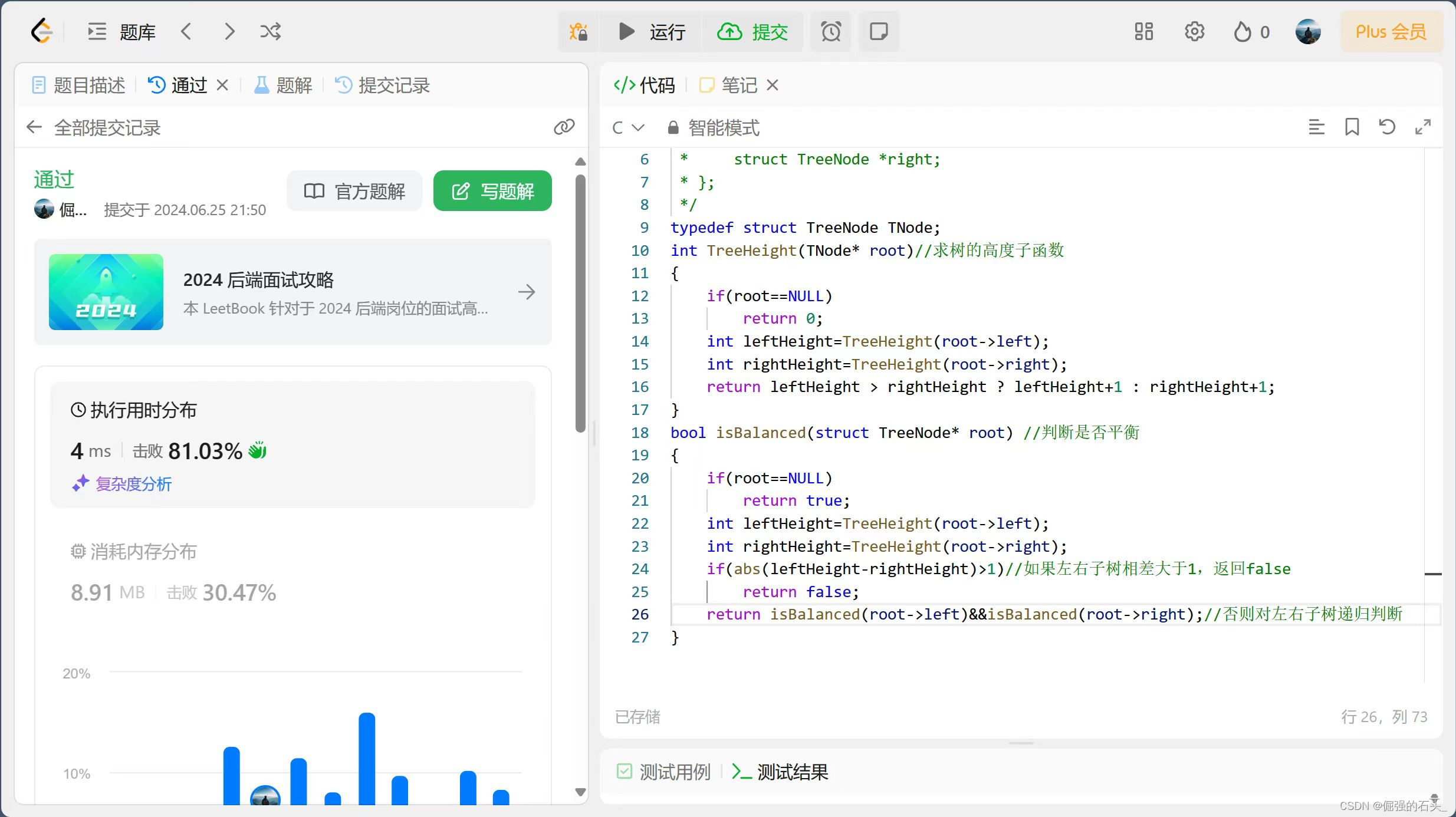 - 在主函数中,使用递归的方式遍历二叉树的每一个节点。对于每个节点,先判断其是否为空树,或者左右子树为空,这两种情况都可以直接判定是平衡的。