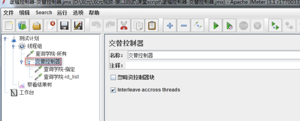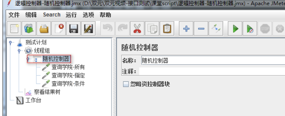 线程组下有3个查询学院请求[所有、指定、条件],使用随机控制器随机执行其中1个请求