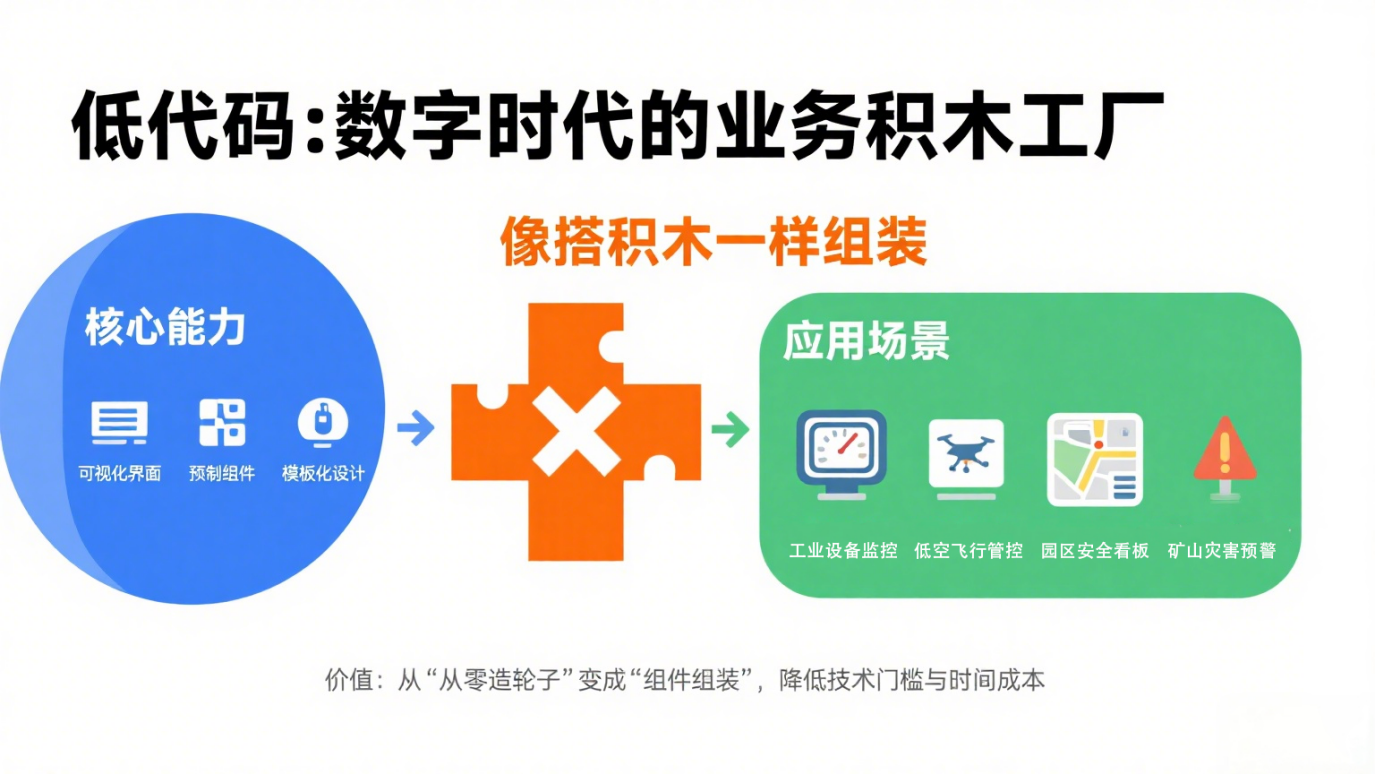 简单说,它是数字时代的 “业务积木工厂”:通过可视化界面、预制组件和模板化设计,让开发者甚至业务人员无需从零编写大量代码,就能像搭积木一样快速搭建应用。从工业设备监控系统到低空飞行管控平台,从园区安全看板到矿山灾害预警系统,低代码将开发从 “从零造轮子” 变成 “组件组装”,大幅降低技术门槛与时间成本。
