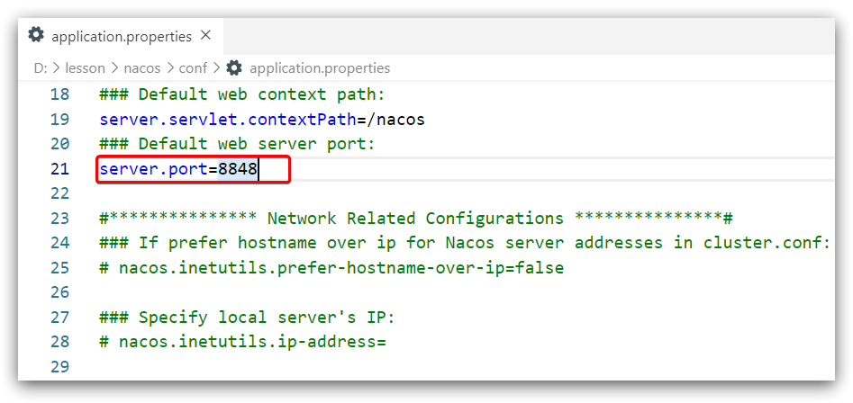 如果无法关闭占用8848端口的进程,也可以进入nacos的conf目录,修改配置文件中的端口: