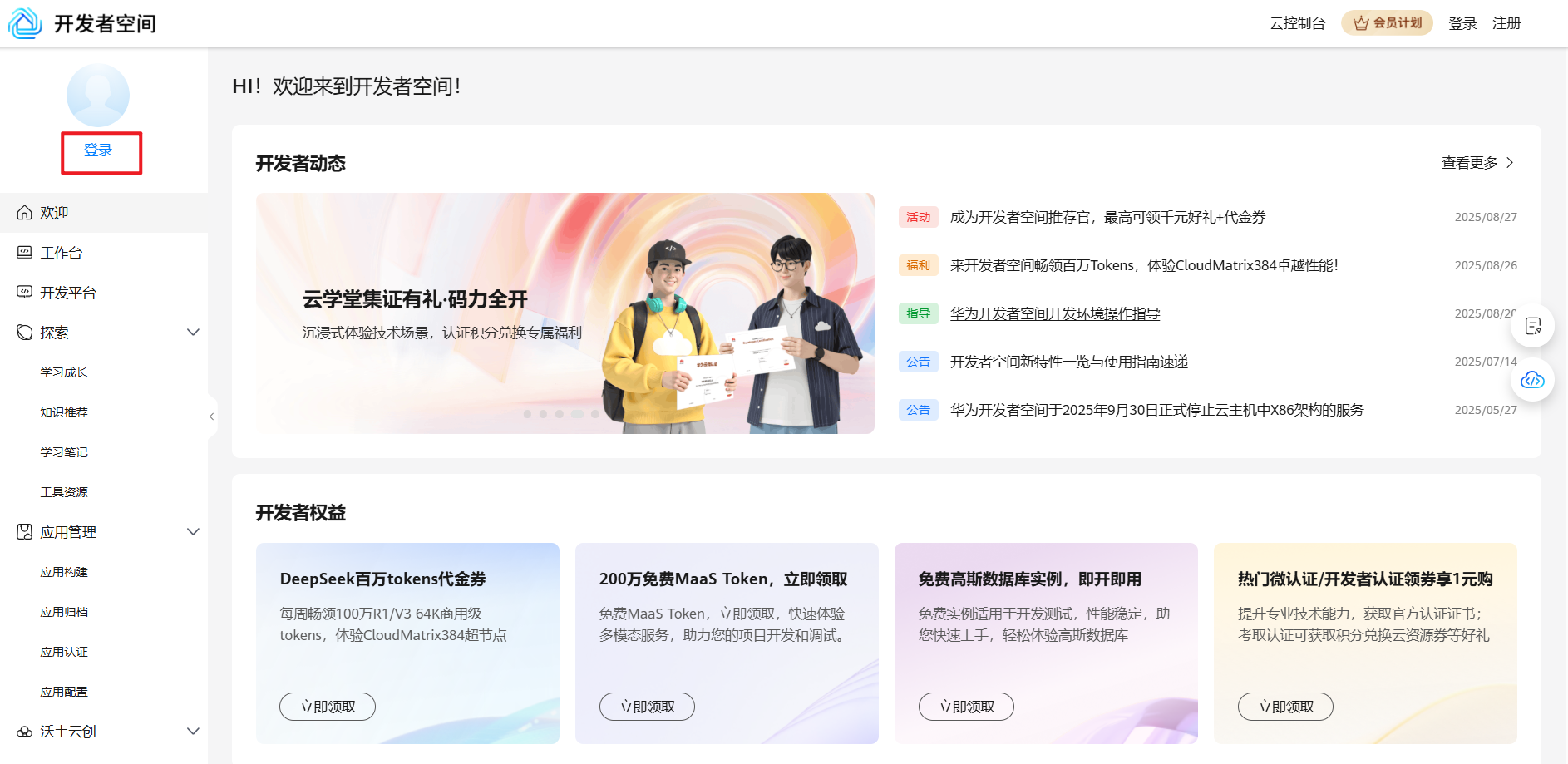 1. 打开开发者空间:https://developer.huaweicloud.cn/space,登录华为云账号。