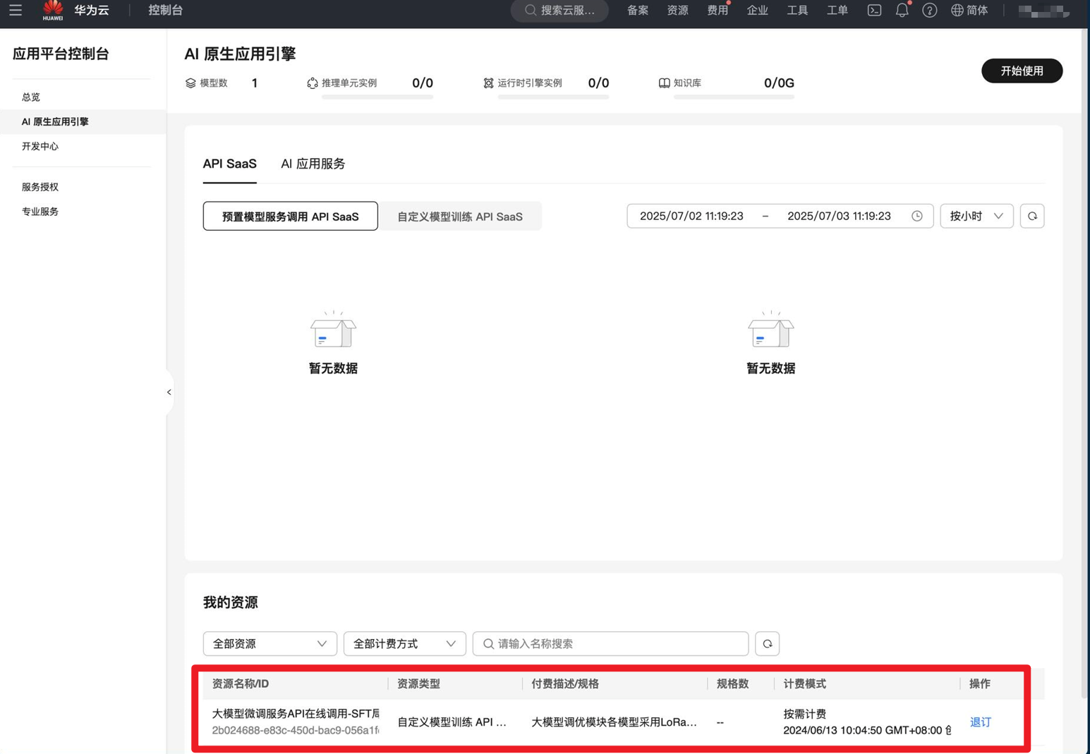 5. 选择“AI原生应用引擎”,退订“我的资源”下的所有资源即可