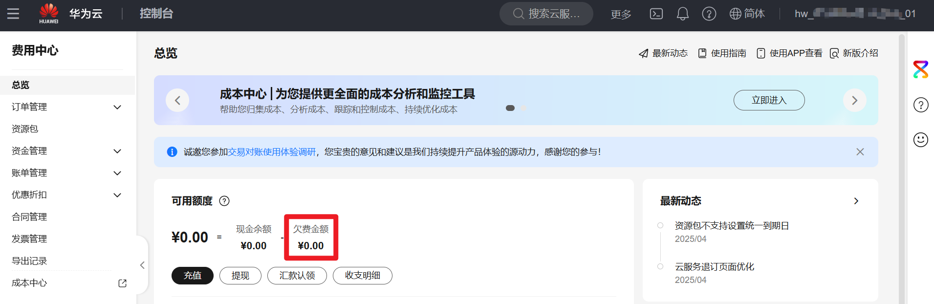 1. 点击右上角个人账号,进入“费用与成本”