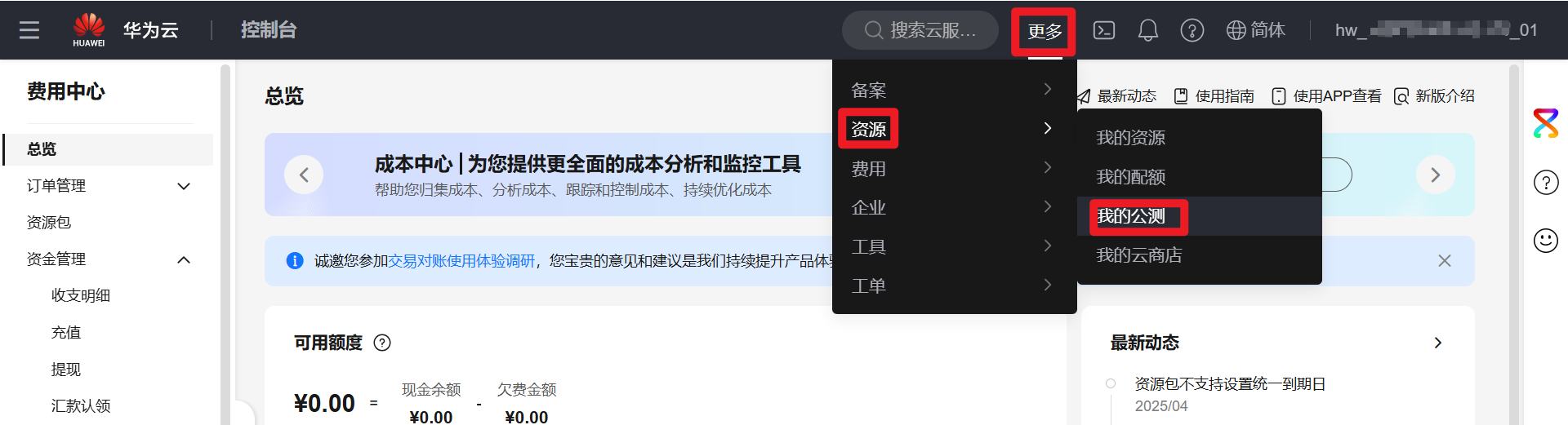 2. 选择菜单栏,“更多”->“资源”->“我的公测”,查看是否申请过应用平台公测