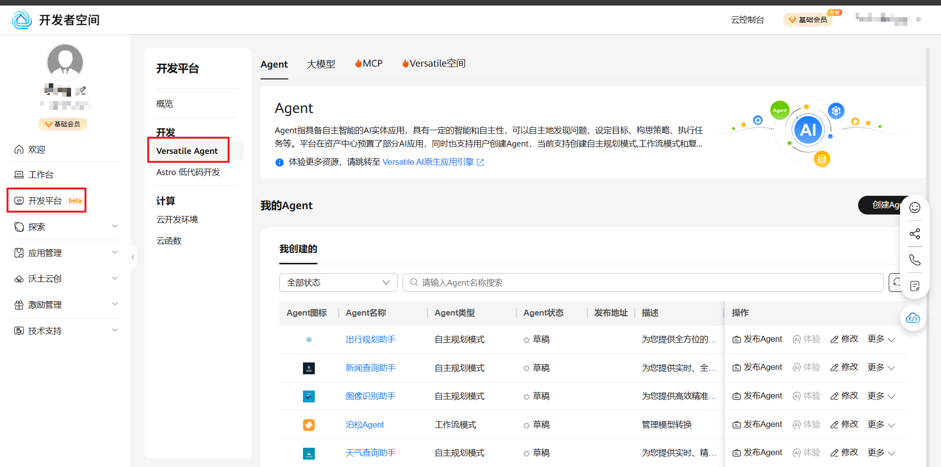 2.选择“开发平台”,选中“Versatile Agent”即可开通使用平台。