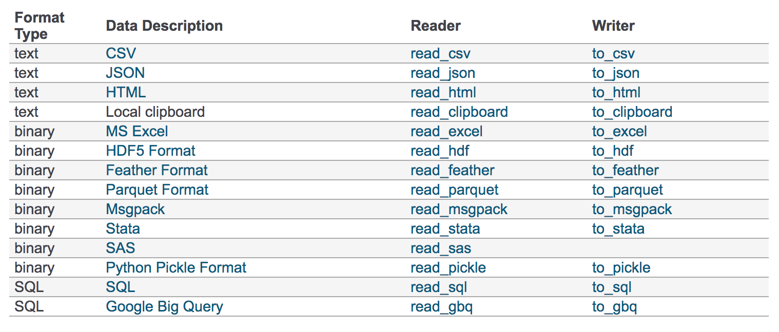 的数据大部分存在于文件当中,所以pandas会支持复杂的IO操作,pandas的API支持众多的文件格式,如CSV、SQL、XLS、JSON、HDF5。