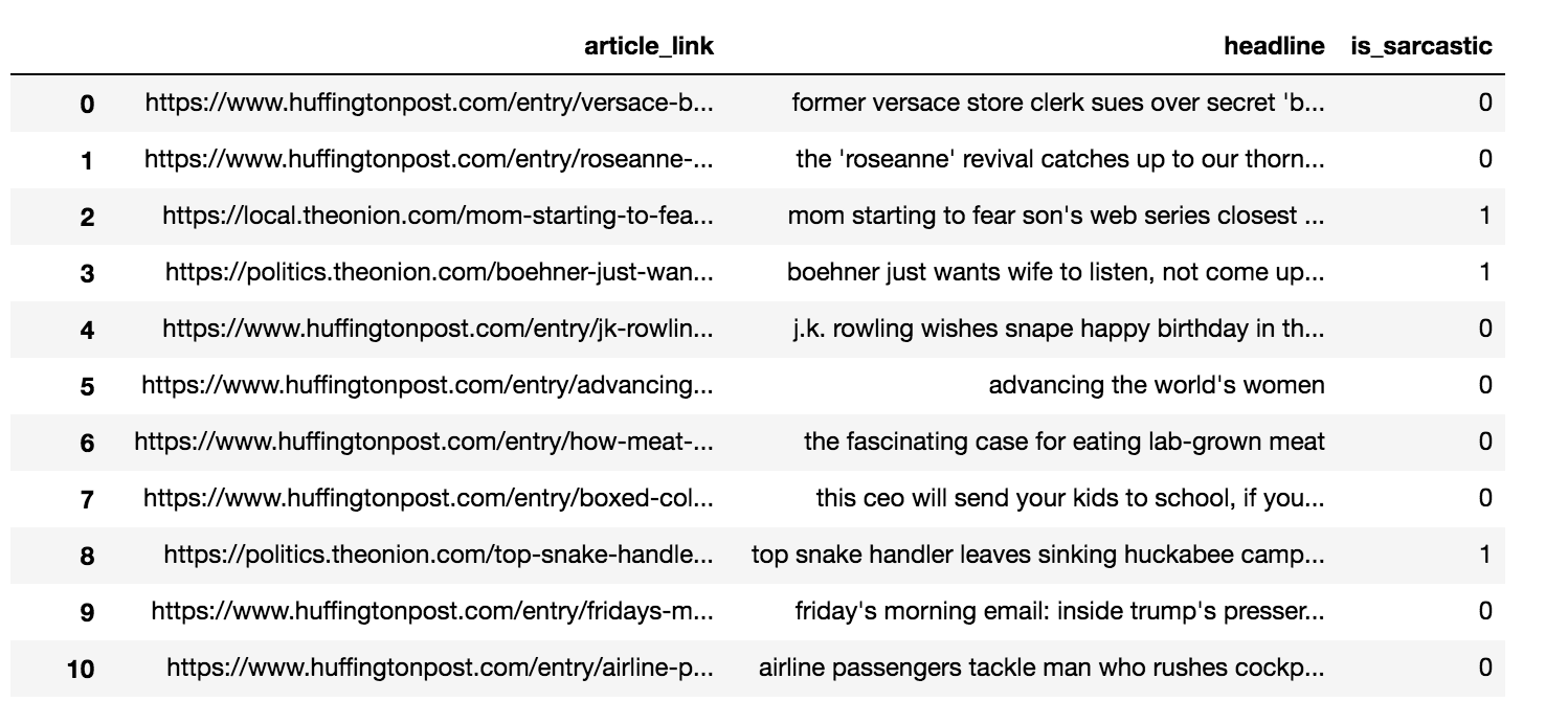 这里使用一个新闻标题讽刺数据集,格式为json。is_sarcastic:1讽刺的,否则为0;headline:新闻报道的标题;article_link:链接到原始新闻文章。存储格式为: