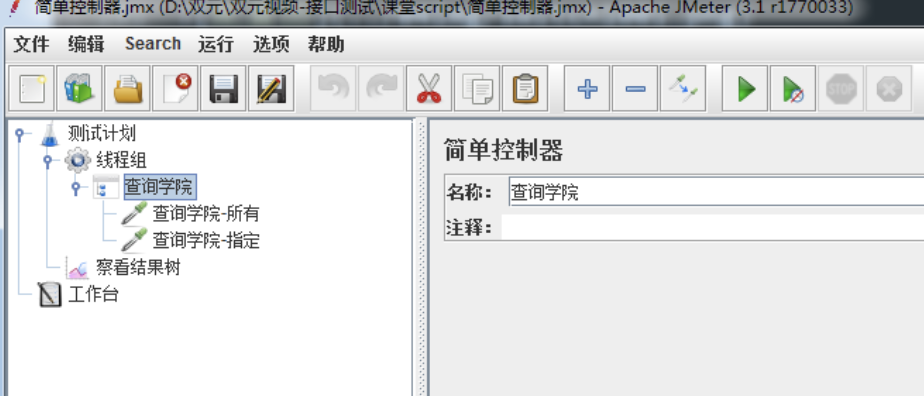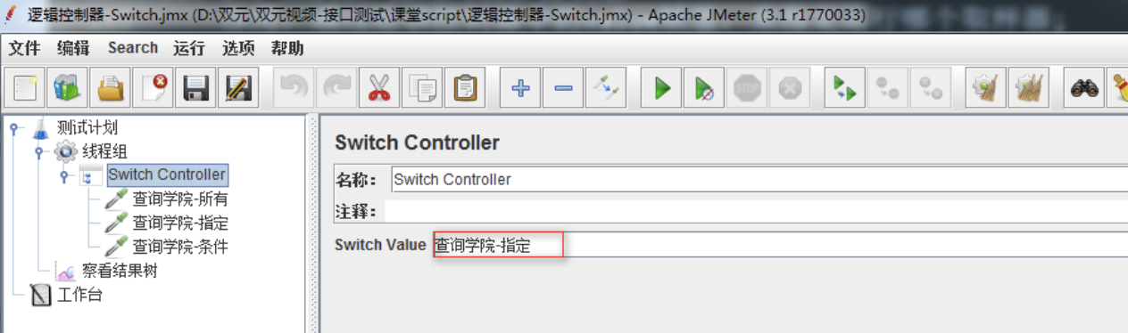 线程组下有3个查询学院请求[所有、指定、条件],使用Switch控制器控制执行指定请求。