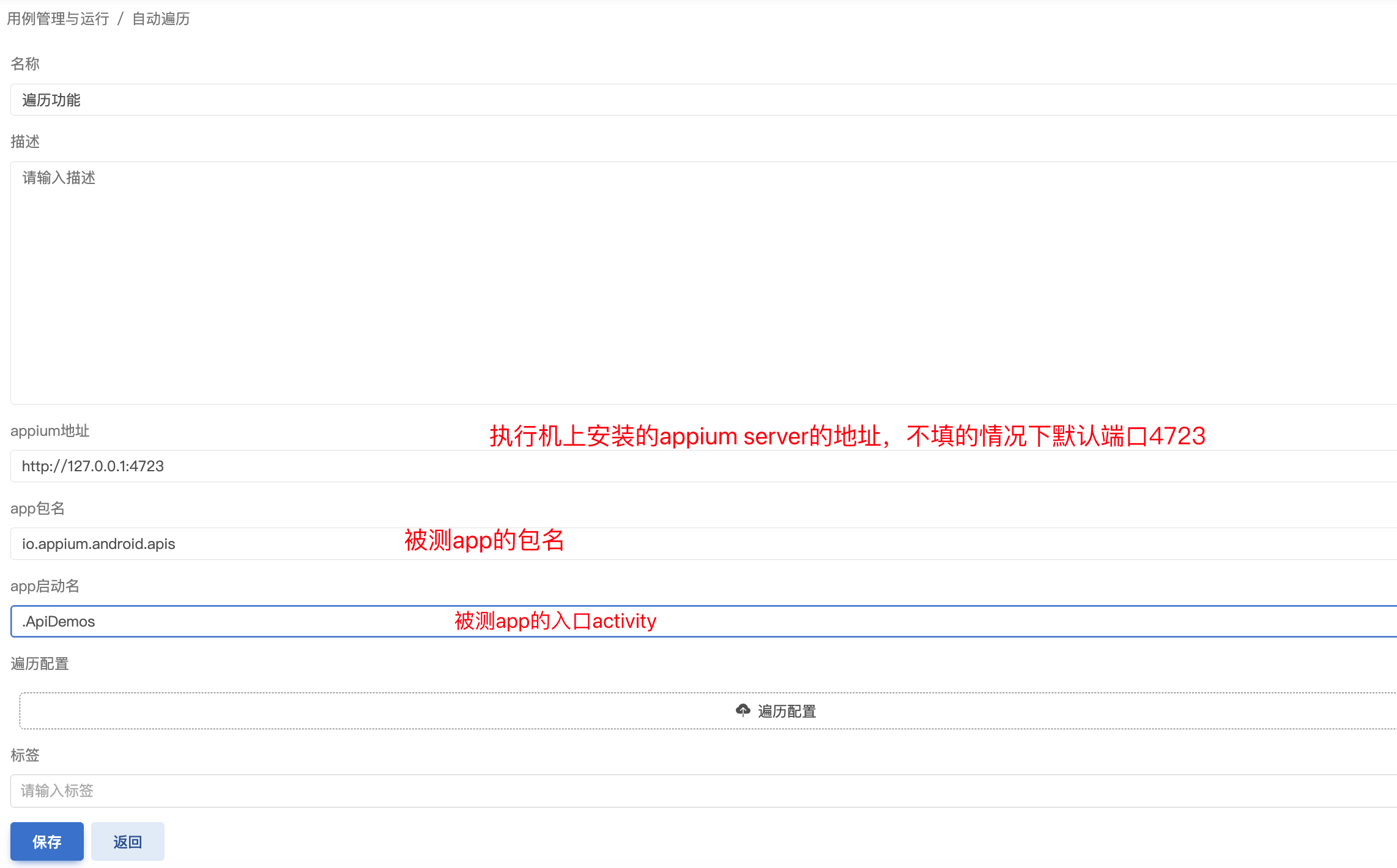 App 自动遍历需提供 appium路径、包名、初始 activity 等必要信息。
