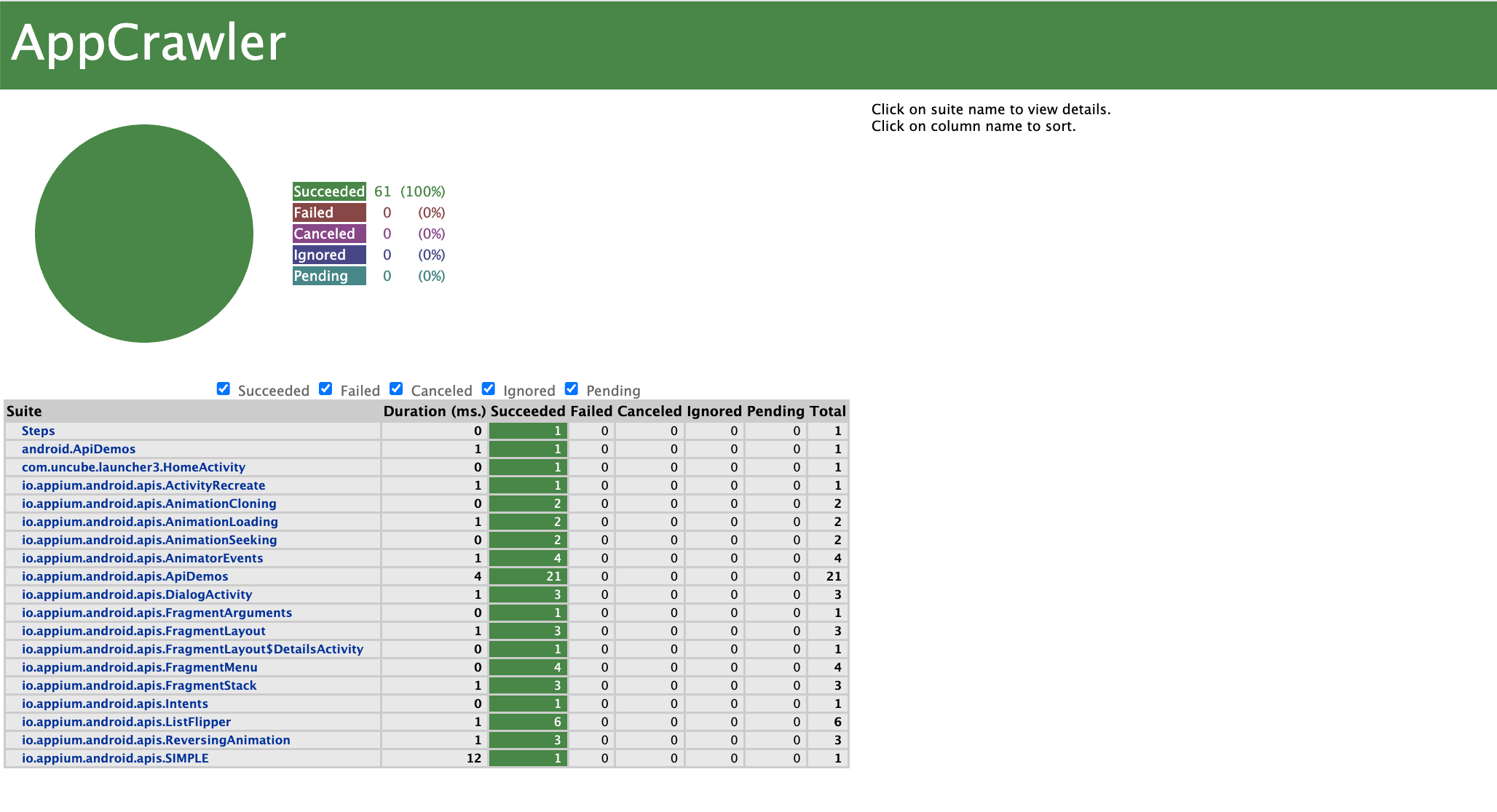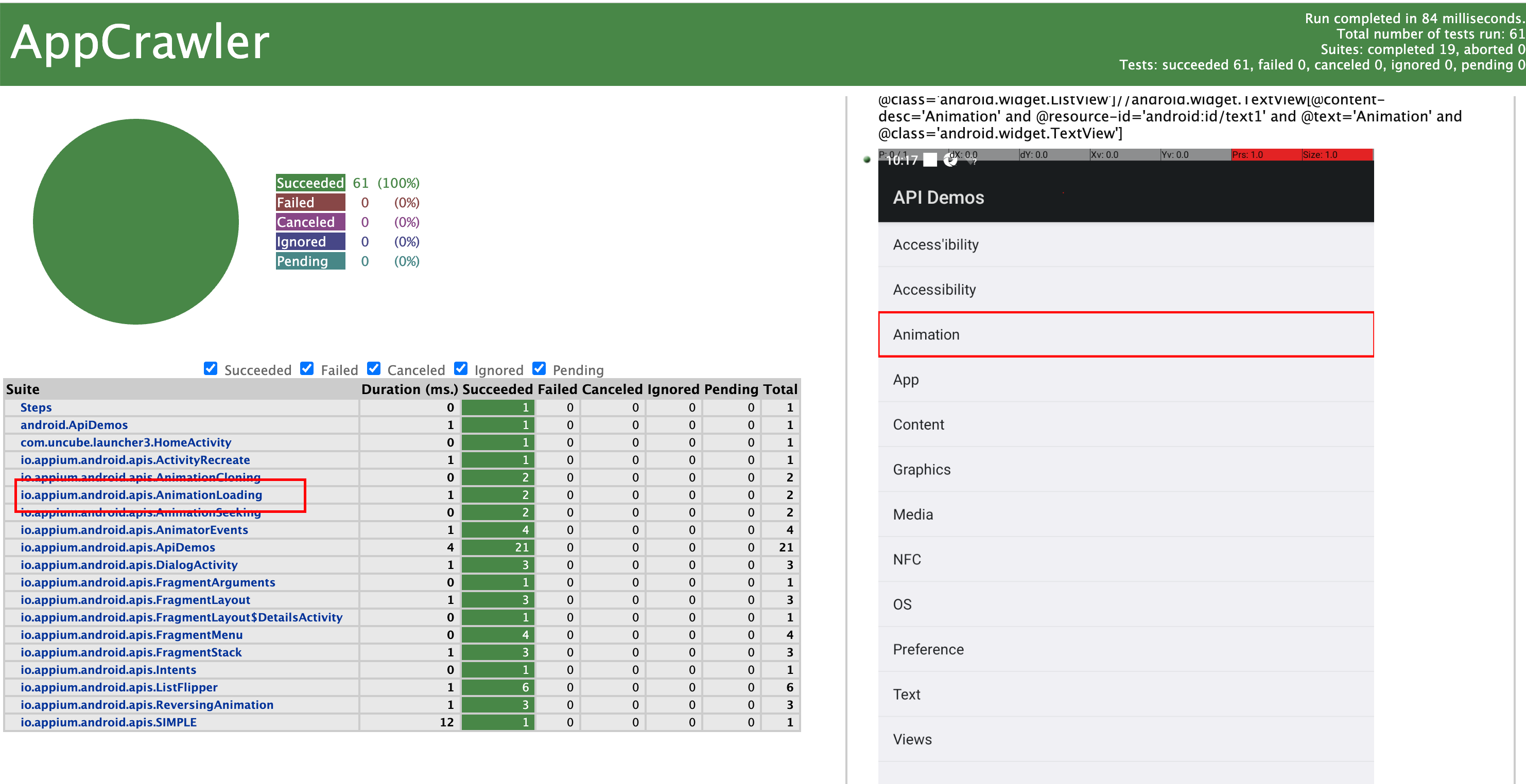 进入测试报告后,点击任意页面即可查看用例执行的结果及遍历的步骤截图,每一步遍历的控件在步骤截图中会被标红,每个页面遍历了多少控件在报告中也会有数字展示。