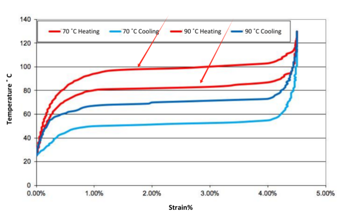 我们可以看到钛丝发生明显收缩时候的温度值是70°,即为钛丝的驱动相变温度。