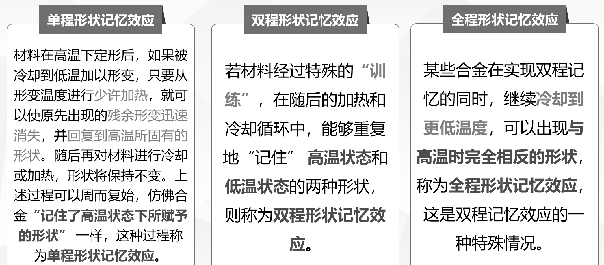 (关于记忆合金的种类应该是单程、双程、全程,由于我们主要用前两种,全程的未在文中说明。另外财哥在专家的指导意见下,就原来写的本章节的错误部分做了纠正,在此由衷感谢金老的支持和无私贡献!)
