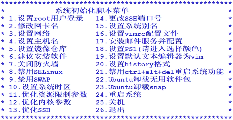 | 2.支持功能禁用SELinux、关闭防火墙、优化SSH、设置系统别名、设置vimrc配置文件、设置软件包仓库、Minimal安装建议安装软件、安装邮件服务并配置邮件、更改SSH端口号、修改网卡名、修改IP地址和网关地址、设置主机名、设置PS1和系统环境变量、禁用SWAP、优化内核参数、优化资源限制参数、Ubuntu设置root用户登录、Ubuntu卸载无用软件包。 |