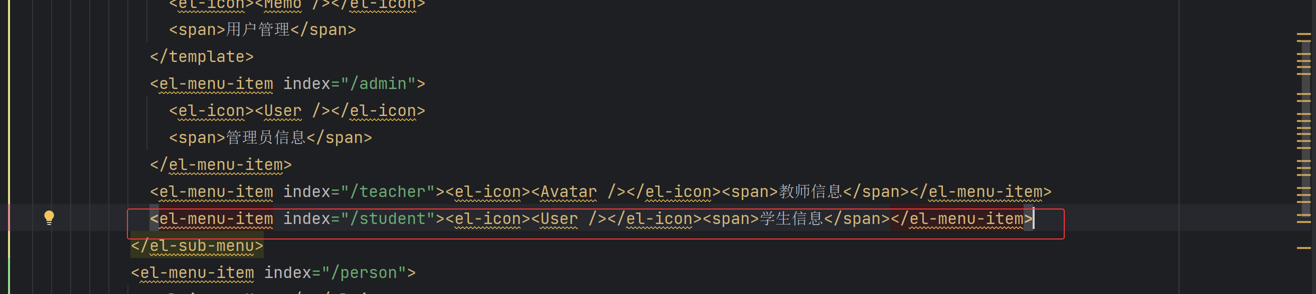 XML <el-menu-item index="/student"><el-icon><User /></el-icon><span>学生信息</span></el-menu-item>