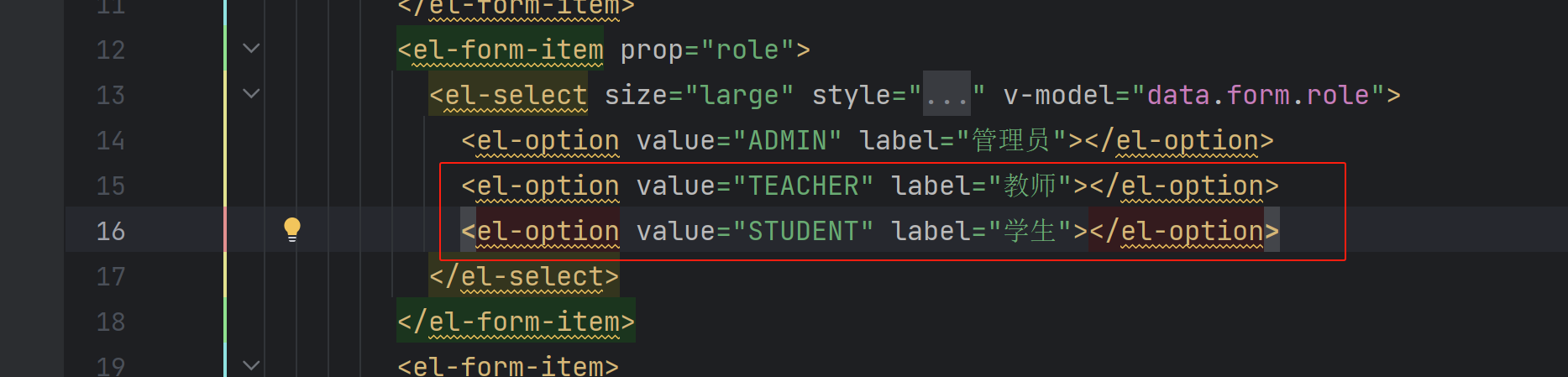 XML <el-option value="TEACHER" label="教师"></el-option> <el-option value="STUDENT" label="学生"></el-option>
