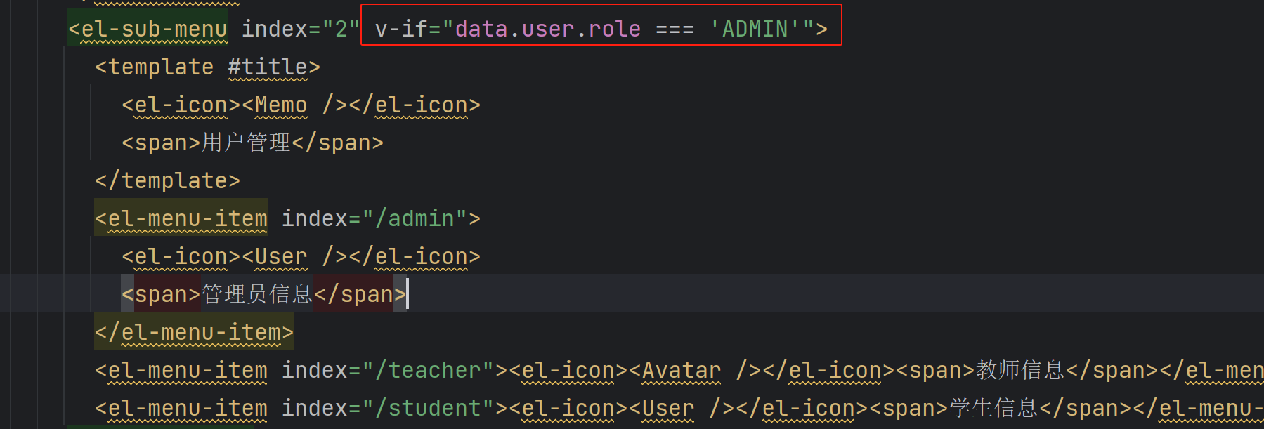XML <el-menu-item v-if="data.user.role === 'ADMIN'" index="/person"><el-icon><User /></el-icon><span>个人资料</span></el-menu-item> <el-menu-item v-if="data.user.role === 'TEACHER'" index="/tPerson"><el-icon><User /></el-icon><span>个人资料</span></el-menu-item> <el-menu-item v-if="data.user.role === 'STUDENT'" index="/sPerson"><el-icon><User /></el-icon><span>个人资料</span></el-menu-item>