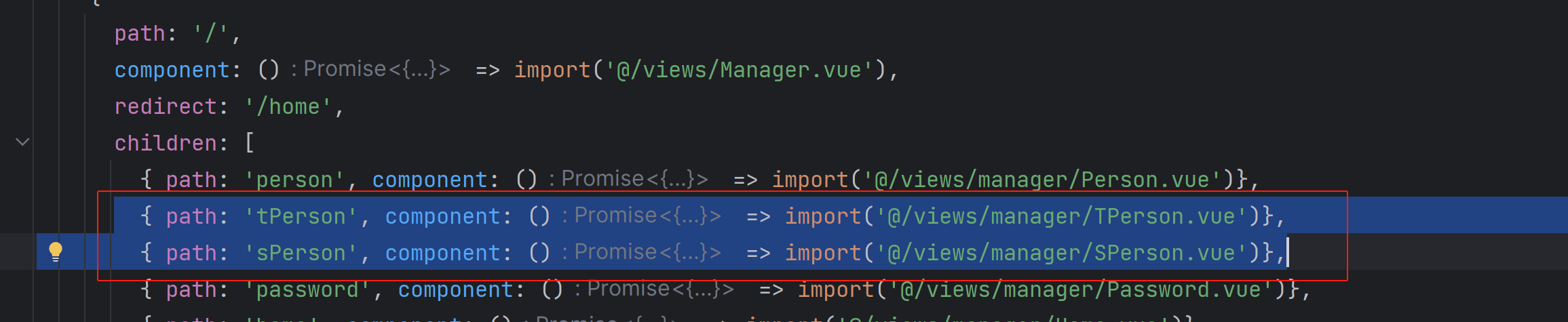 TypeScript { path: 'tPerson', component: () => import('@/views/manager/TPerson.vue')}, { path: 'sPerson', component: () => import('@/views/manager/SPerson.vue')},