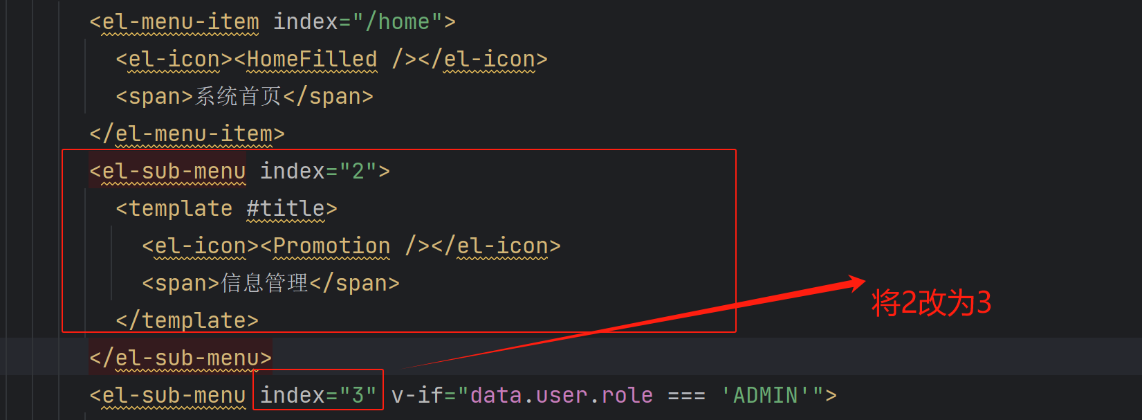 XML <el-sub-menu index="2"> <template #title> <el-icon><Promotion /></el-icon> <span>信息管理</span> </template> <el-menu-item index="/college"> <el-icon><OfficeBuilding /></el-icon> <span>学院信息</span> </el-menu-item> </el-sub-menu>