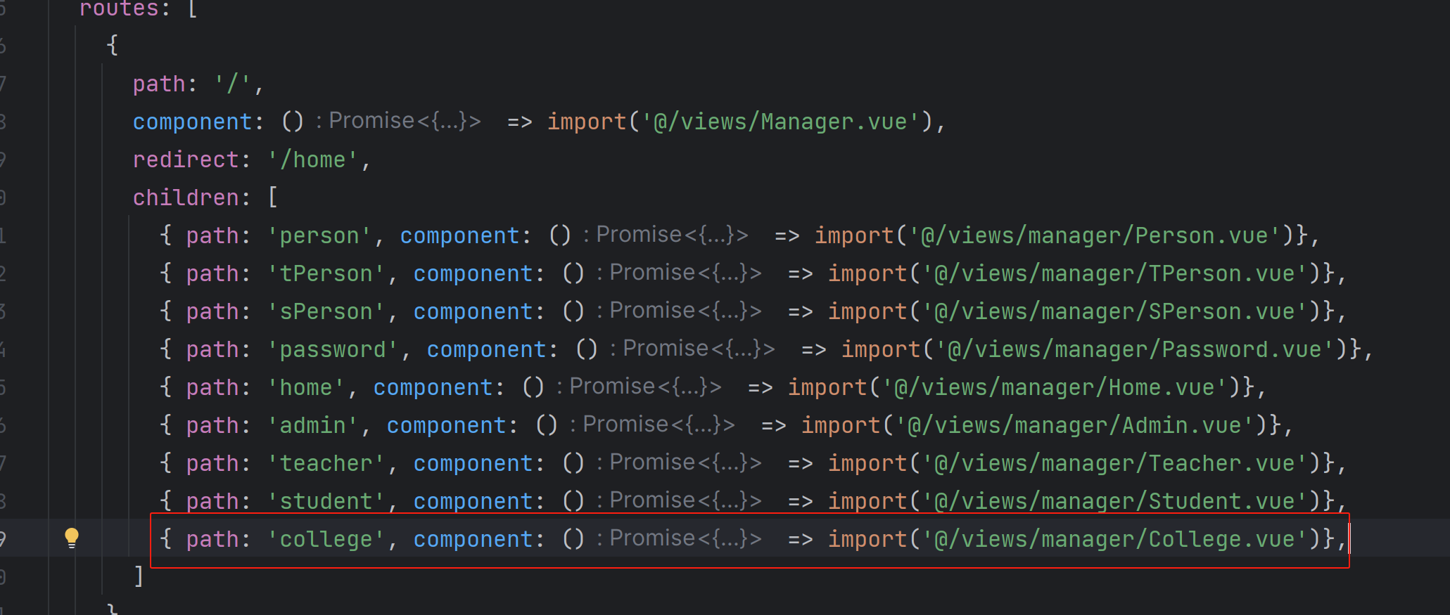 TypeScript { path: 'college', component: () => import('@/views/manager/College.vue')},