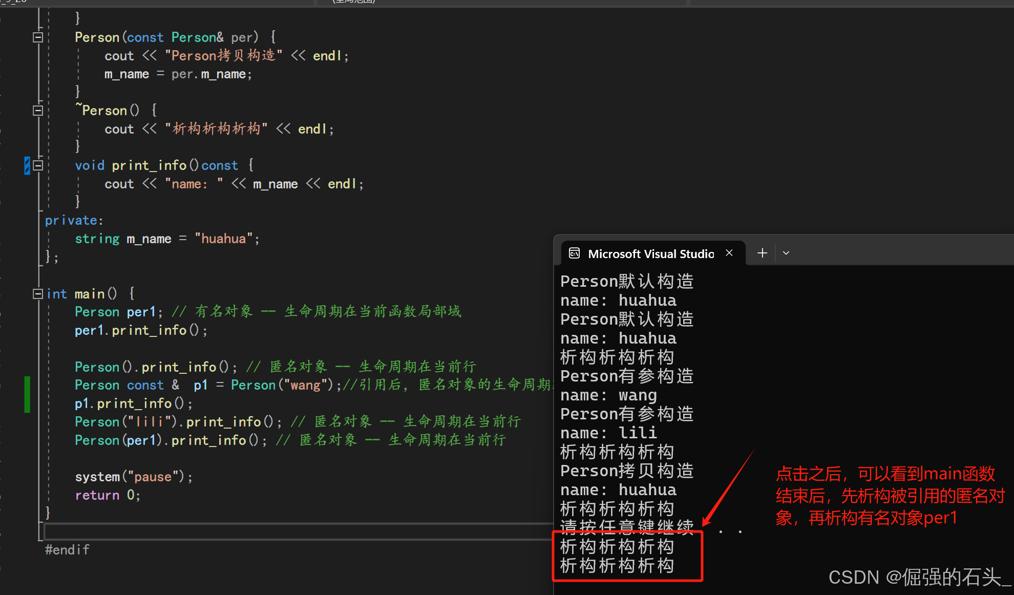 mian()结束后,析构两个局部对象,先是被常量引用的匿名对象析构(因为同一域内 后构造的先析构),然后是有名对象per1被析构