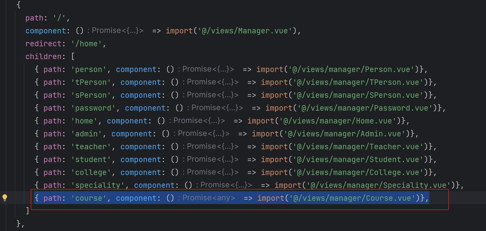 TypeScript { path: 'course', component: () => import('@/views/manager/Course.vue')},
