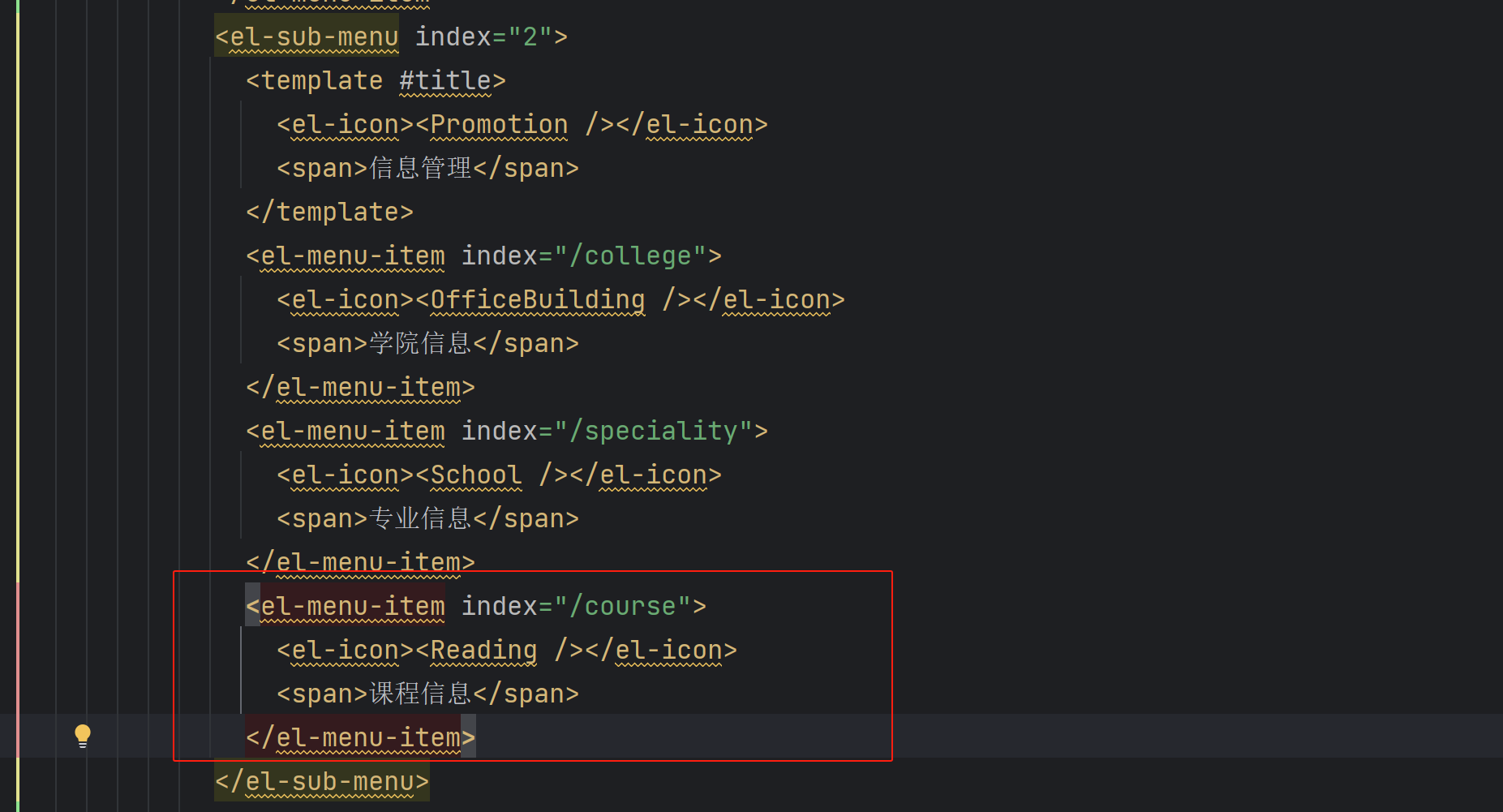 XML <el-menu-item index="/course"> <el-icon><Reading /></el-icon> <span>课程信息</span> </el-menu-item>