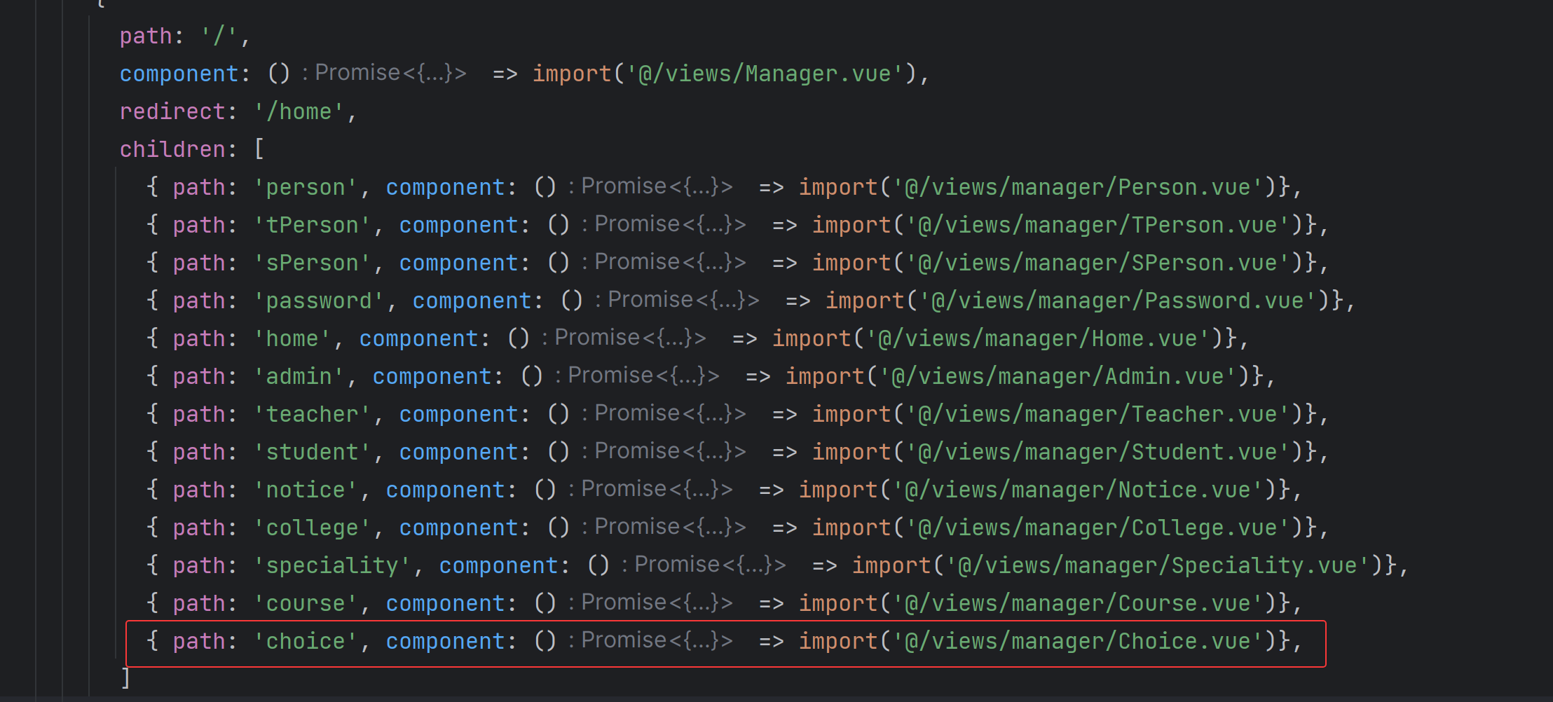 Java { path: 'choice', component: () => import('@/views/manager/Choice.vue')},
